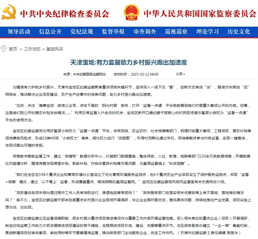 10月12日,中央纪委国家监委网站刊文《天津宝坻:有力监督助力乡村振兴跑出加速度》,关注报道了宝坻区纪委监委聚焦重点领域关键环节,坚持深入一线下沉“督”、创新方式有效“治”、瞄准方向跟进“促”相结合,推动解决企业项目建设、农户生产经营中的各类问题,助力乡村振兴跑出加速度