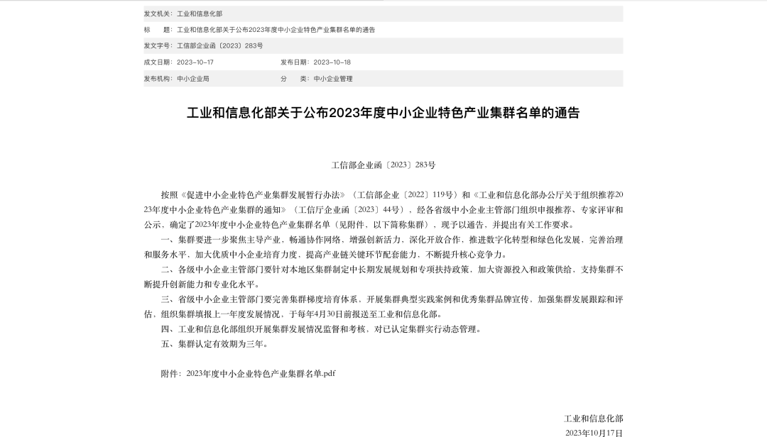 日前,工业和信息化部发布2023年度中小企业特色产业集群名单的通告,宝坻区动力电池材料产业集群遴选为2023年度国家中小企业特色产业集群。