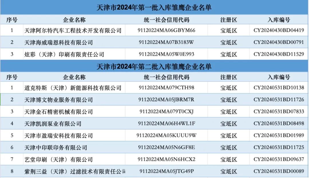 近日,天津市科技局公示了2024年第二批雏鹰企业入库名单,道克特斯(天津)新能源科技有限公司、天津金石精密机械有限公司、天津中印联印务有限公司等8家企业获批天津市雏鹰企业备案。