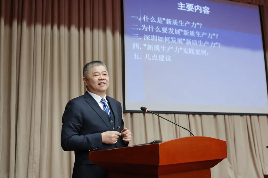 4月2日上午,宝坻发展大讲堂暨区委理论学习中心组集体(扩大)学习在宝坻宾馆举行,深圳市生产力促进中心研究院院长杨刚勇为全区广大党员干部作了一场以《勇下科技棋 敢创新产业 善打组合拳——“新质生产力”解码》为题的专题讲座,为我区发展新质生产力把脉开方。区委书记毛劲松主持并讲话。区委副书记、区长郭康伟,区政协主席田志武等区领导出席。