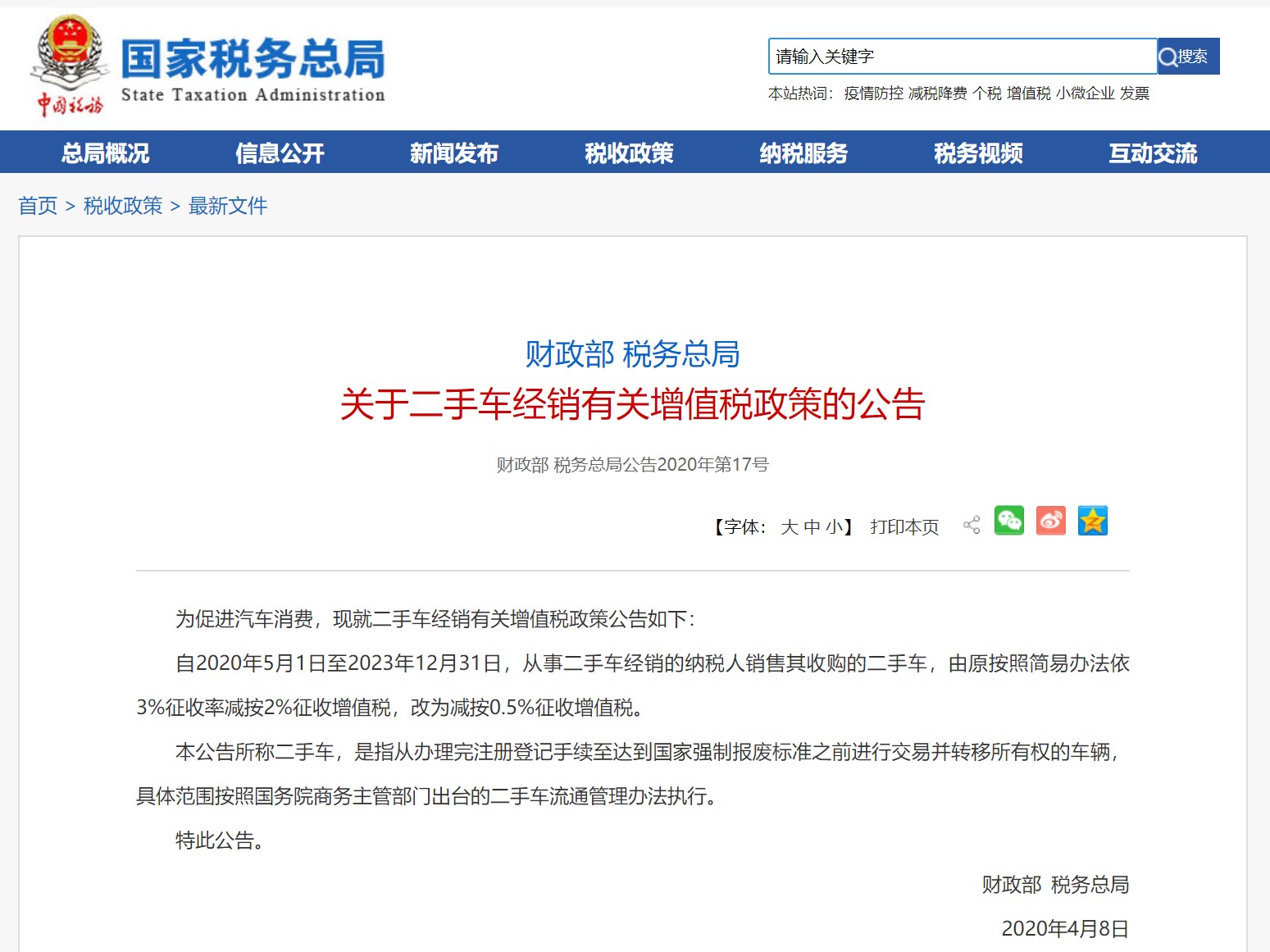 2020年4月8日财务部 国家税务总局发布《关于二手车经销有关增值税政策的公告》,为促进汽车消费,自2020年5月1日至2023年12月31日,从事二手车经销的纳税人销售其收购的二手车,由原按照简易办法依3%征收率减按2%征收增值税,改为减按0.5%征收增值税。