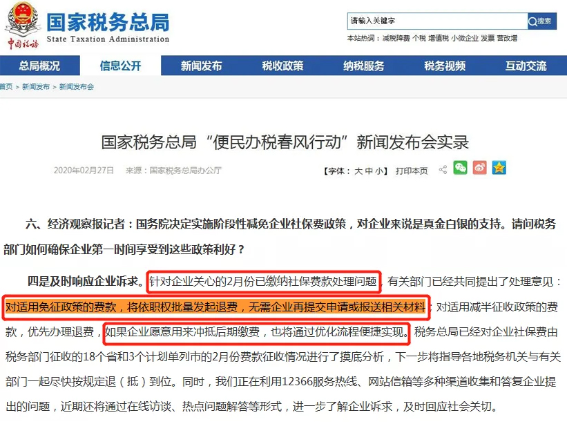 国家税务总局“便民办税春风行动”新闻发布会在2月27日举行,明确2月份已缴纳的社保费将批量发起退费,无需企业再提交申请或报送相关材料。