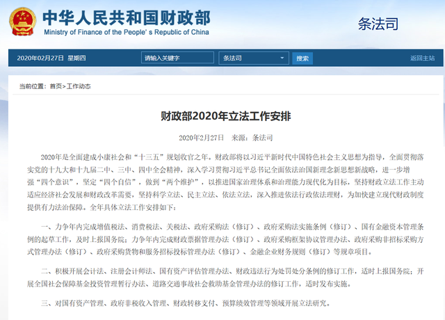 据财政部官网最新消息,公布了财政部2020年立法工作安排,明确力争年内完成增值税法、消费税法、关税法、政府采购法(修订)、政府采购法实施条例(修订)、国有金融资本管理条例的起草工作。